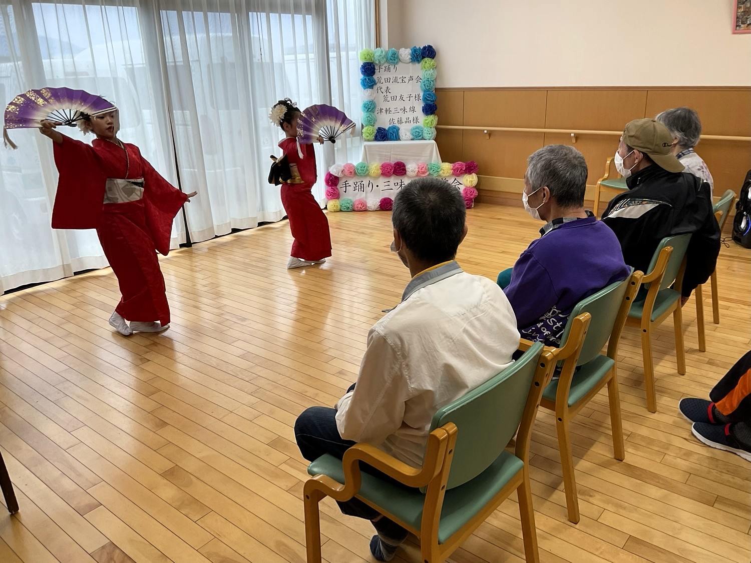 芸術の秋、この度は『手踊り 荒田流宝声会』様と『津軽三味線 佐藤晶』様が山郷館くろいしに来て下さり、演題にそって披露してくださいました。普段、触れることのない芸能の世界を感じられるひと時となりました。